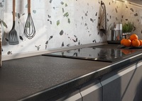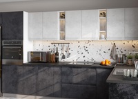 Модульная кухня без ручек с гладкими матовыми фасадами с имитацией шлифованного бетона.