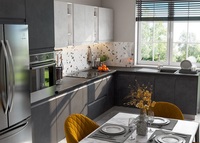 Угловая кухня с матовыми фасадами. Длина – 150 см, ширина – 120 см.